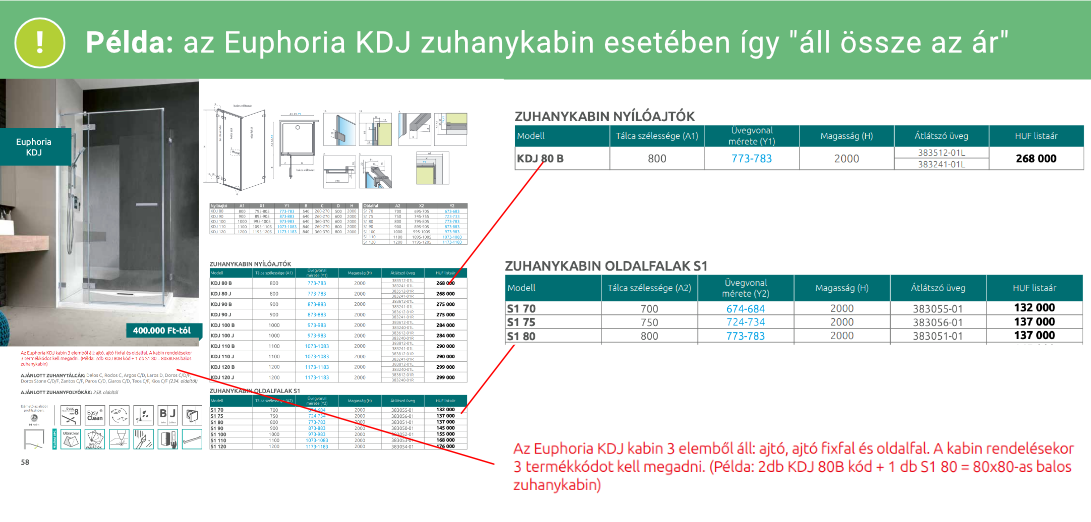 Megnézem a táblázatban a KDJ 80B árát: 268.000 Ft. Megnézem az S1 80 listaárát, ami 137.000 Ft. Összeadva 405.000 Ft a zuhanykabin.