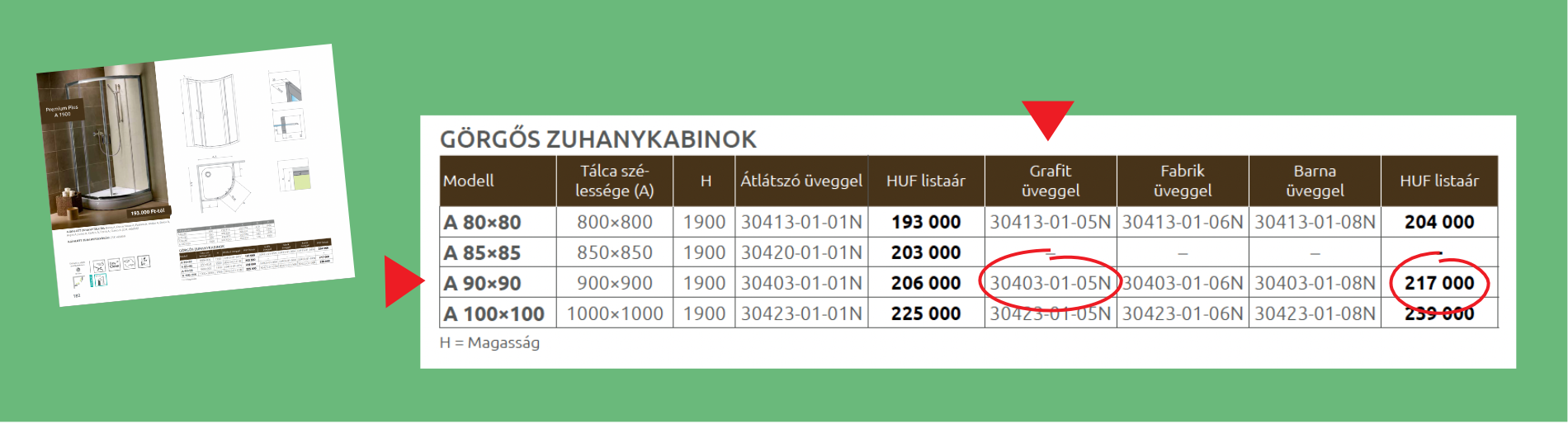 Ha nincs piros betűs kiegészítés, akkor az adott modell egyetlen cikkszámból áll. Nézd meg a 182. oldalon a Premium Plus íves zuhanykabint: ha egy 90×90-eset adok el a vevőmnek grafit üveggel (mert megmutatom neki, ő meg beleszeret), akkor ezt a cikkszámot adom le rendeléskor: 30403-01-05N – és látom a listaárát: 217.000 Ft.