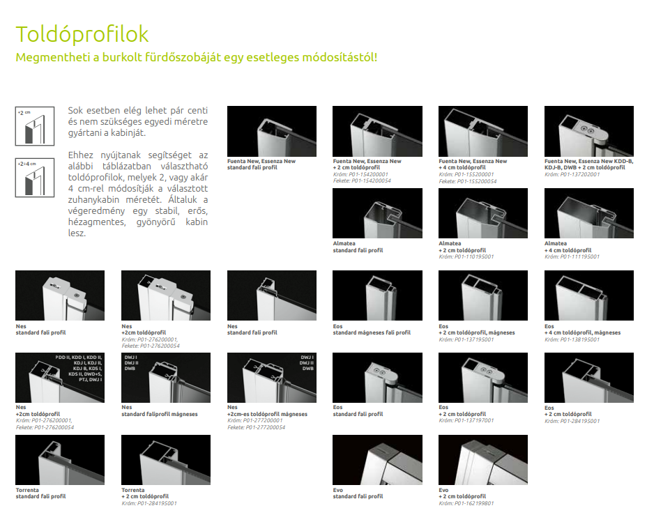 Ha az adott kabinnál ezt az ikont látod, akkor lapozz a 230. oldalra és nézd meg, hogy milyen méretű toldóprofillal növelhető a zuhanyzó mérete. A toldóprofil lényege, hogy gyorsan találsz megoldást bontás és átépítés nélkül korrigálhass, úgy, hogy ne kelljen egyedi méretben legyártani a kabint 3-4 hetes határidővel.
