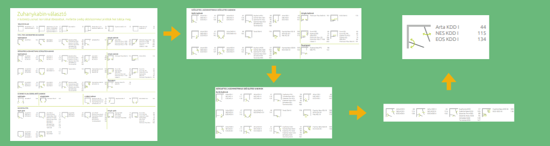 A vevővel általában a kialakítás szűkítésével indulsz: Walk-in legyen vagy zuhanykabin? Épített zuhanytérre keres ajtót? Íves, vagy szögletes? Görgős, vagy nyíló ajtós? Amikor megvan, látod az összes termékcsaládból a vonatkozó kialakítás oldalszámát.