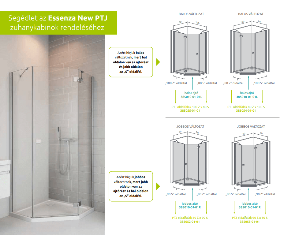…aszimmetrikus PTJ kabinnál rendeléskor eligazodni? Lapozz a 264. oldalra: látod, hogyan néz ki balos ajtóval (felül) és jobbos ajtóval (alul) a két eltérő méretű oldal. Mindegyik tökéletesen funkcionális: a vevőd dönti el, hogy melyiket szeretné – te pedig a megrendelés beküldésekor figyelj, hogy mekkora oldalfalakat és milyen ajtót kérsz. A két példa pontosan megmutatja, hogy mit értünk Z és S oldalfalakon.