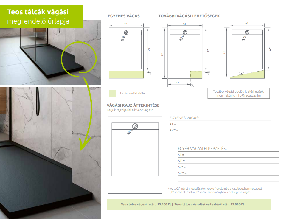 A Teos tálcák műszaki rajzán van egy „B” méret. Ezen területen lehetséges a vágás. B méretnél nagyobb vágás nem lehetséges. Ezekre figyelj nagyon. Látod, hogy mennyi a vágásnak a költsége és van még egy felár a „csiszolási és festési felár”. Ez csak akkor játszik, ha a vágott él látható lesz a beépítés után. Ha a falnál lesz, akkor ezt elhagyhatod.