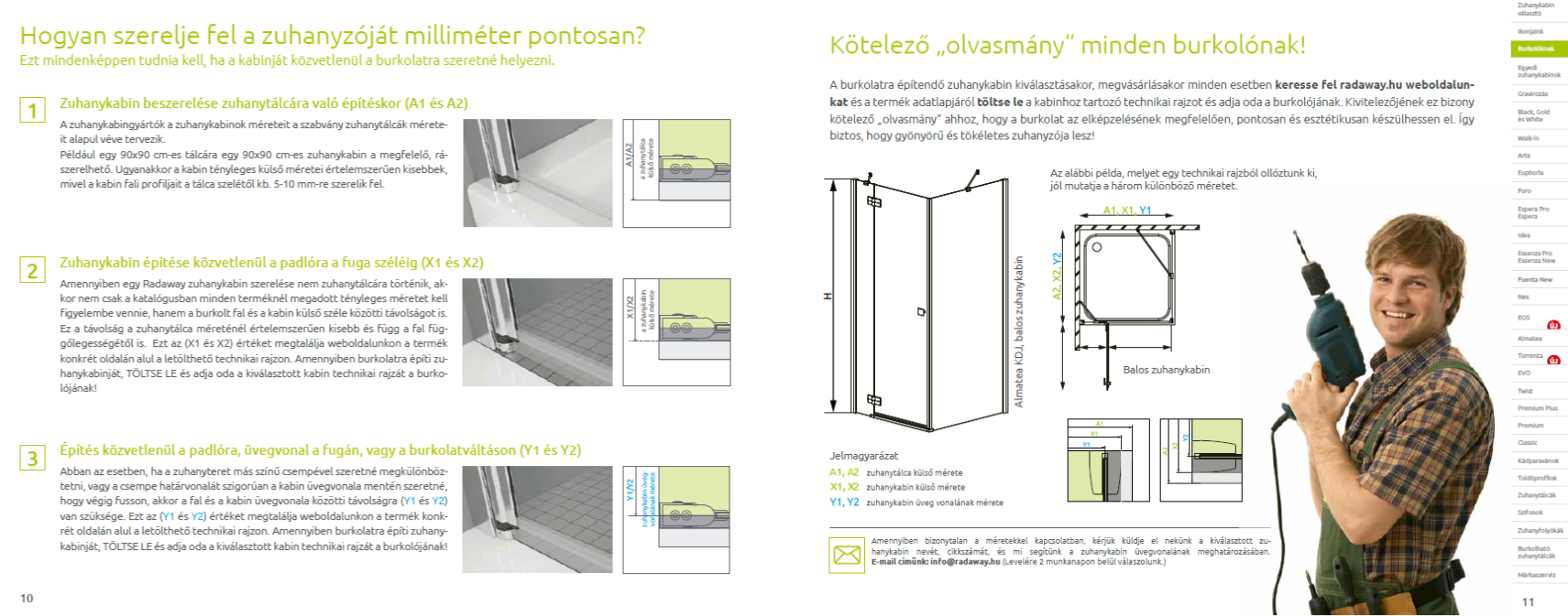 Milyen méretekről van szó? Lapozz a 10-11. oldalra és olvasd át: ez mutatja meg, hogy a zuhanykabin termékoldalán (és a műszaki rajzon) szereplő méretezések közül melyik mit jelent és hogyan kell velük dolgozni. Ezek ismeretével lehet milliméterpontos illeszkedéssel beépíteni a zuhanyzót, hogy az ajtó és az üvegvonal pontosan ott legyen, ahova a vevőd megálmodta. A vevődnek fogalma sincs arról, hogy például egy 90×90-es zuhanykabin üvegvonala nem 90×90, hanem mondjuk 88x88cm környékén fut…