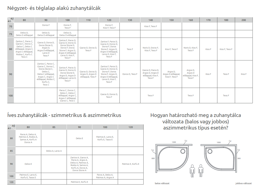 A 232. oldalon látsz egy táblázatot, ami gyors eligazítást jelent: látod, hogy hányszor hányas zuhanytálcákból mekkora a kínálat – így nem fogsz fölöslegesen lapozgatni, hogy a termékoldalon derüljön ki, hogy ja abból pont nincs akkora. Ez a mátrix táblázat segít kiválasztani gyorsan a megfelelő mérethez a tálcát, tálcákat.
