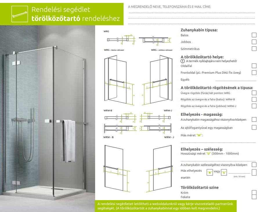 …törölközőtartót megrendelni? A 265. oldal megmutatja, hogy a törölköző tartó lehet üveg-üvegen, vagy üveg-falon. Ezzel az űrlap kitöltéssel tudod megadni a tartó hosszát és pozícióját is. Egyszer olvasd át és látni fogod az összes lehetőséget. Ezt egyszer megérted, utána akárhányszor eladod.